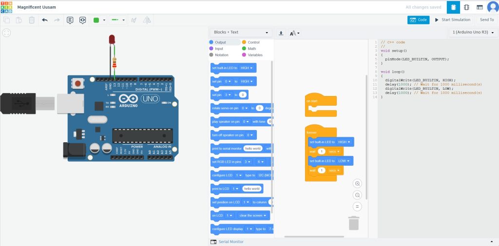 ➡️ Správanie musí byť rovnaké ako na reálnom Arduine. Ak neviete schému yakresliť, vyhľadajte v Basic Components „arduino“ a prekopírujte „Blink“.