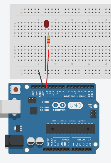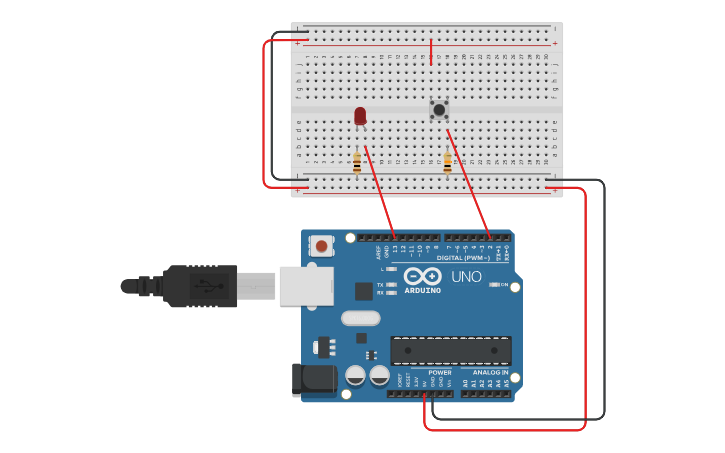 - zapoj LED a tlačidlo rovnako ako v reále,