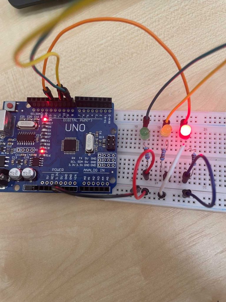 Cieľom cvičenia je zostrojiť a naprogramovať jednoduchý semafór, ktorý postupne rozsvieti zelenú, žltú a červenú LED v pevne definovanom poradí a časových intervaloch.
